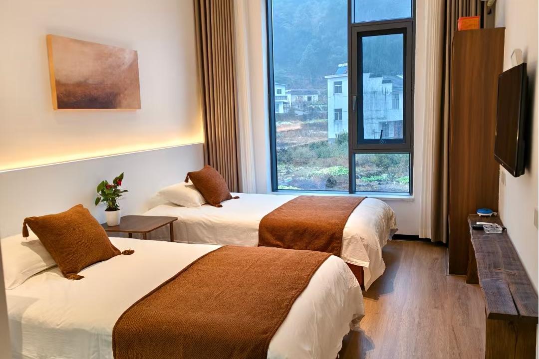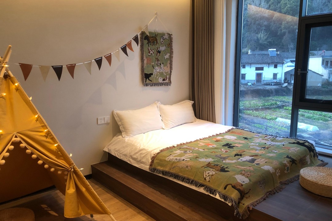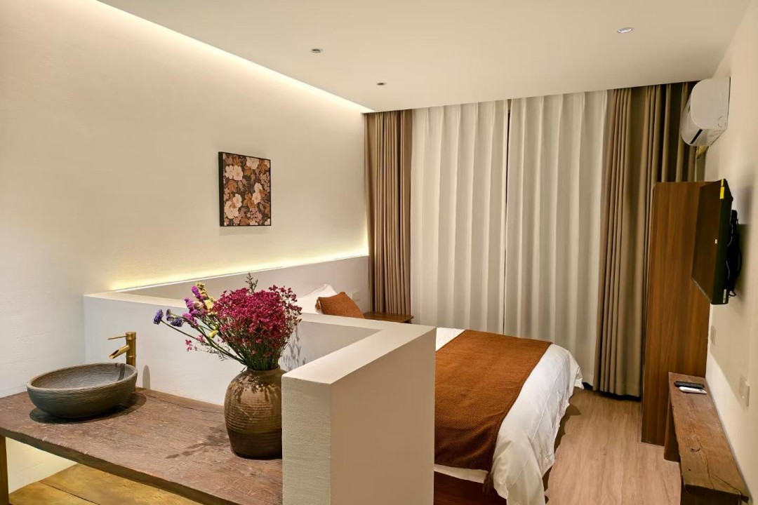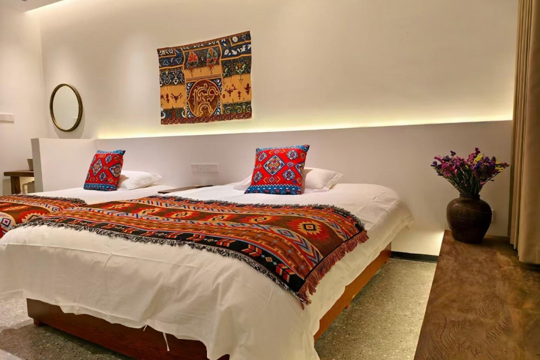 映像家园环境优越,内里为您提供有6间舒适客房,拥有2间标间、1间大床房、2间亲子间和1间套房,可同时接待14人入住。主人给房间整体做了装修升级,采用全新的风格进行布置,环境鲜明又时尚,属现代装修融合了民族元素的设计,精选素雅的木质家具和品质高端的棉麻床品,同时配备有空调、电视、无线网、独立卫浴等齐全设施,采光通透,松弛感拉满;平常不想出门,在房间内也能欣赏远山的秀美风光,整体入住体验感非常不错。