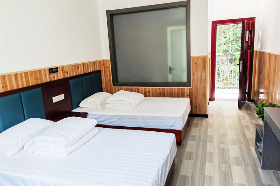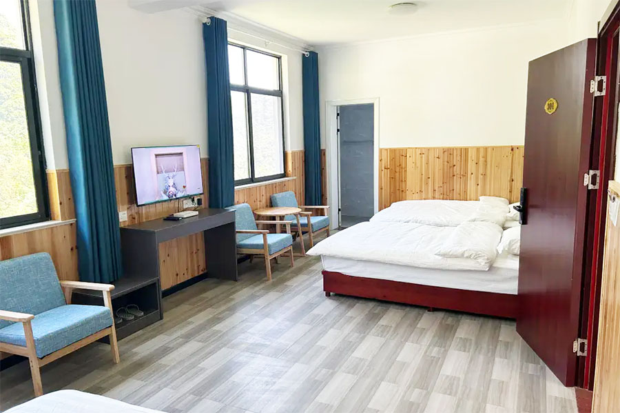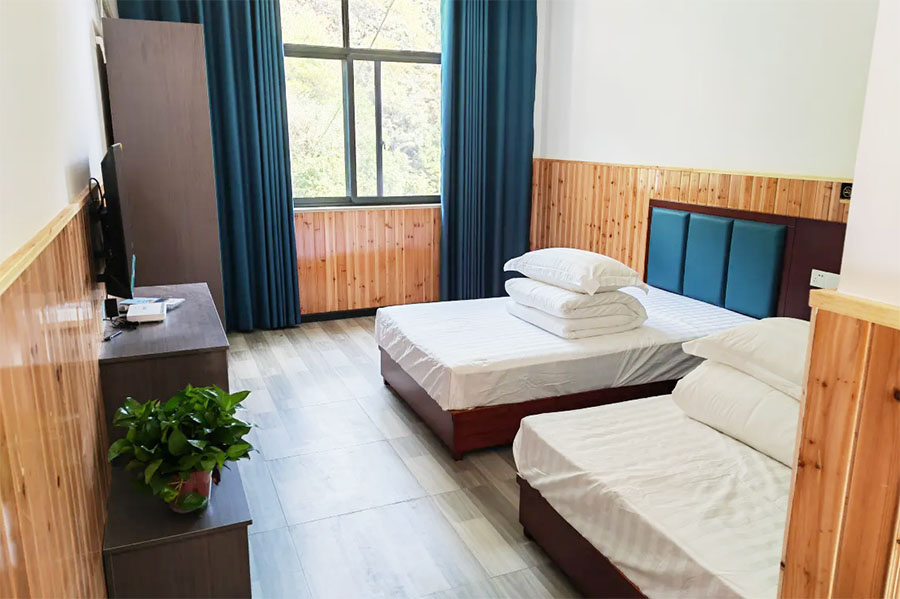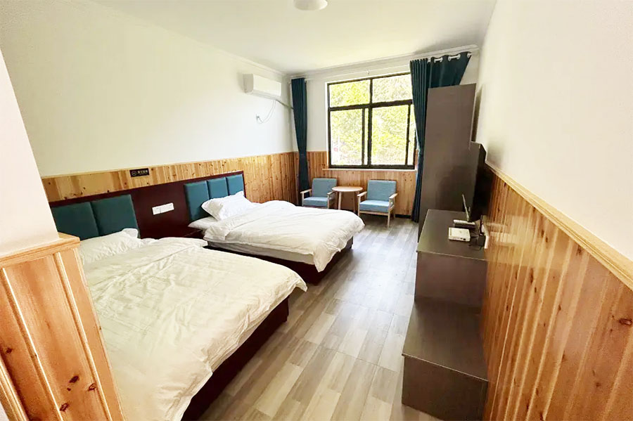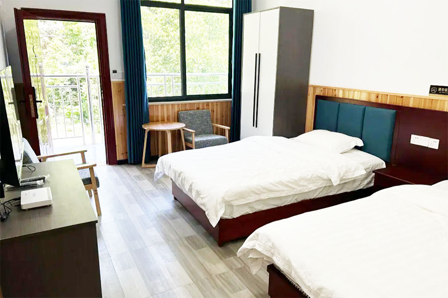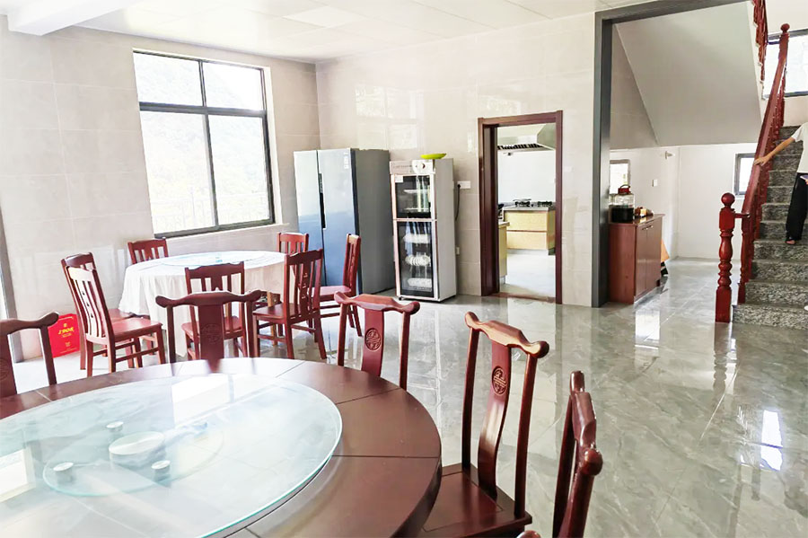 石台和信农家乐整体环境雅致清幽,依自然地势而建,气派的三层小楼与山野景致浑然相融,周边竹林青翠,繁花点缀,石阶通幽、溪水潺潺,可谓是开门见山,推窗揽绿,处处皆是原生态的山野诗意。小院规模适中,共有8间客房,设有7间标间和1间三人间,能同时接待17人入住、就餐。客房内部装修简约雅致,褪去了繁冗的装饰,空间通透敞亮,采光极佳,尽显返璞归真的自然之美。房间床品柔软亲肤,配套设施一应俱全,是您沉浸于山野,放松身心的极致享受。