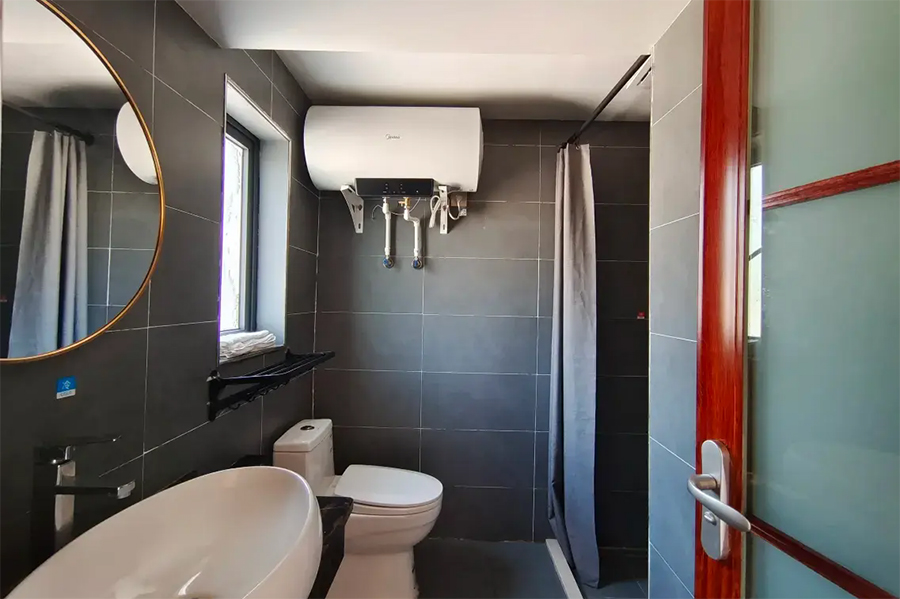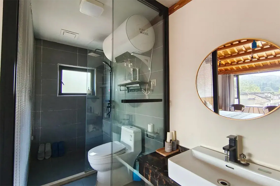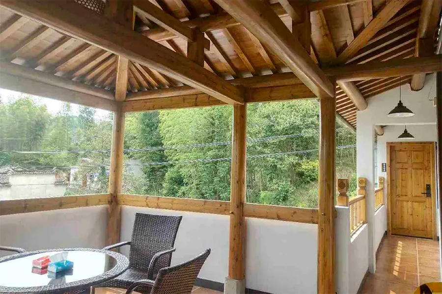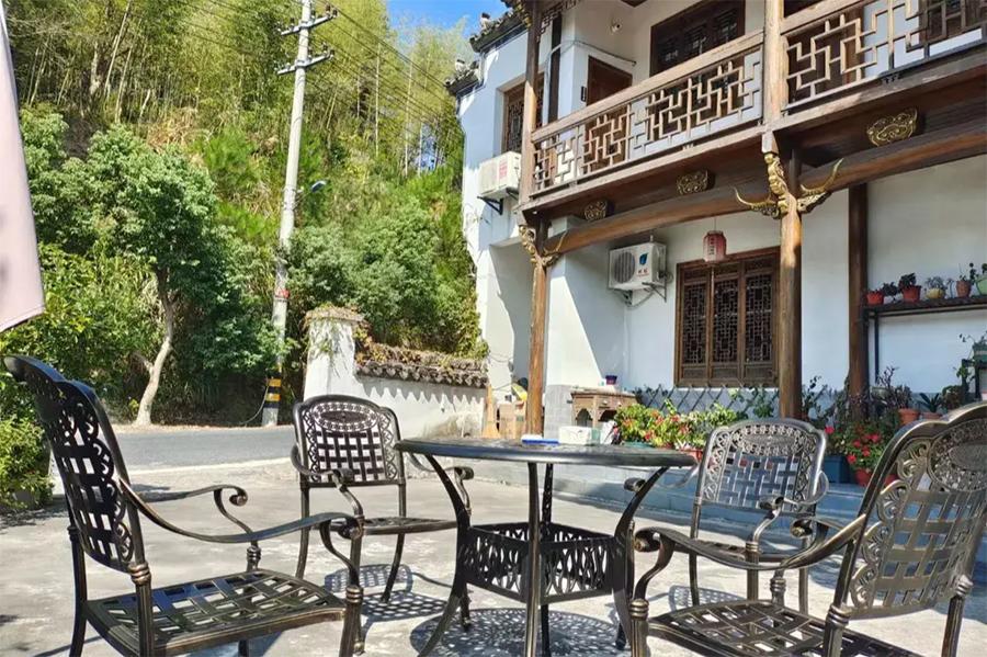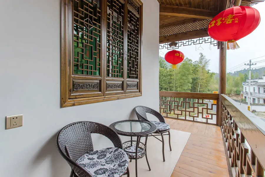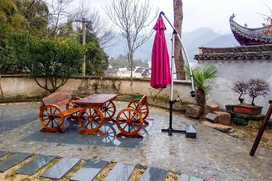 客栈是在徽派古建筑宅院的基础上进行改造,融入适当的现代实用性元素,既有古风的结构严谨,精湛雕镂,也有时尚舒适的宜居感。庭院整体外观风格古雅,经典的马头墙、小青瓦,显得古色古香,院中青石铺路,墙角边有随意摆放的山石、盆栽,中央位置有纯木的露天桌椅,整体感觉是一番充满了怡然自得的惬意闲适,若能在这里小住上几天,尽情体验田园乡间的古风生活,一定给出的治愈。
