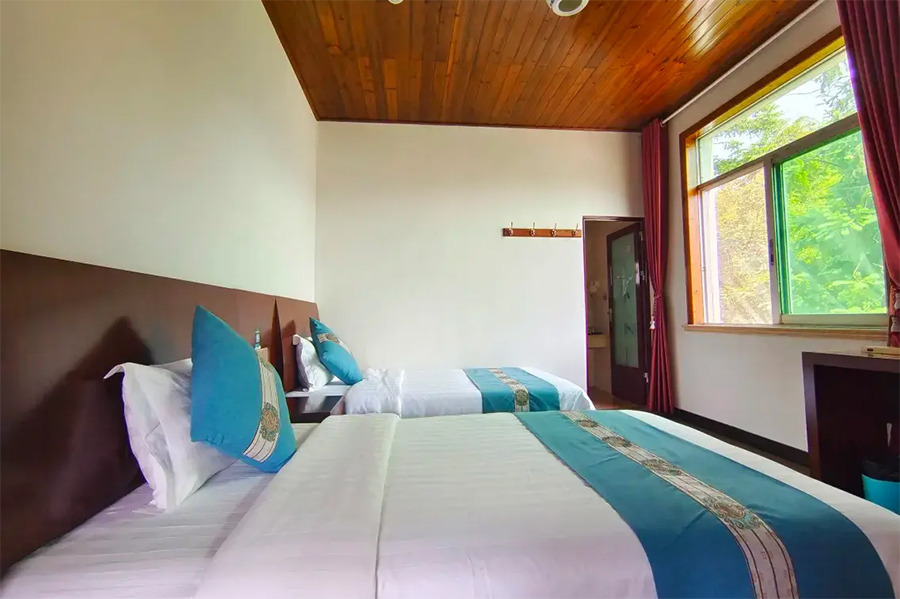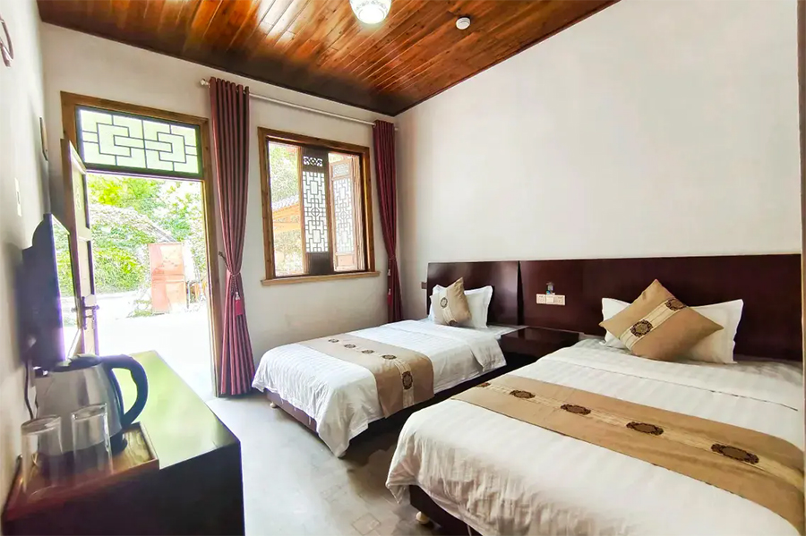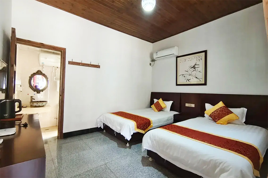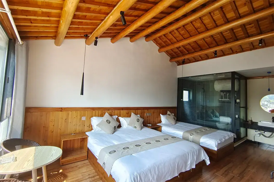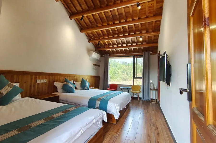 客栈共有精品客房10间,可同时接待20位宾客入住,各房间装饰一新,是浓郁的复古田园风,实木吊顶,木家具、木地板,色调沉稳,氛围温馨,可远眺山林美景的落地大窗,视野极佳。院主精心挑选的高端亲肤床品,非常的舒心助眠,住宿体验非常优质,特别适合接待家庭出游、亲子游、情侣度假以及小团体出游入住。