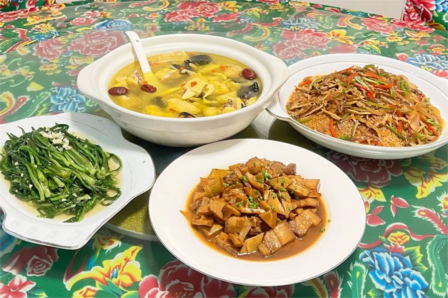 石耳炖土鸡,梅干菜扣肉,梅渚白切羊羔、灵芝鸡...等,菜品荤素搭配,影音美味,顿顿不重样。