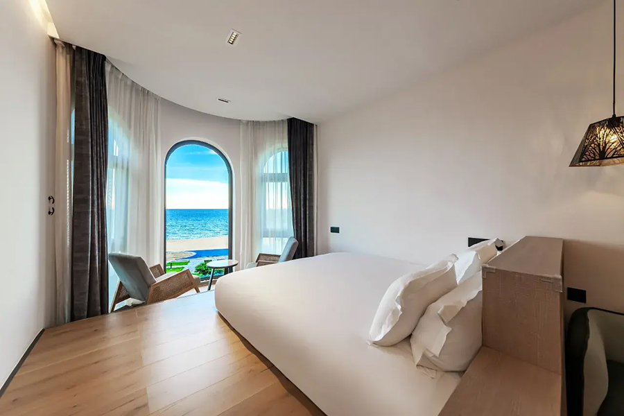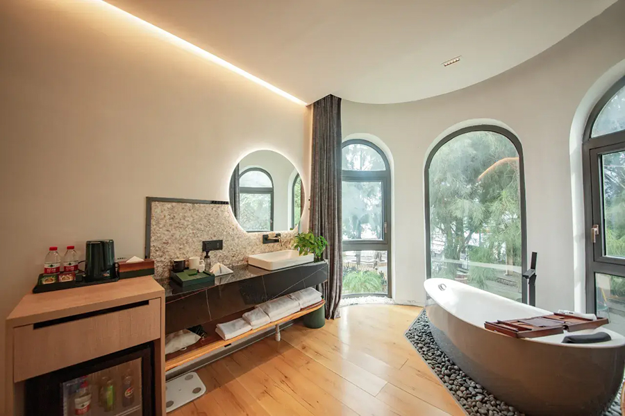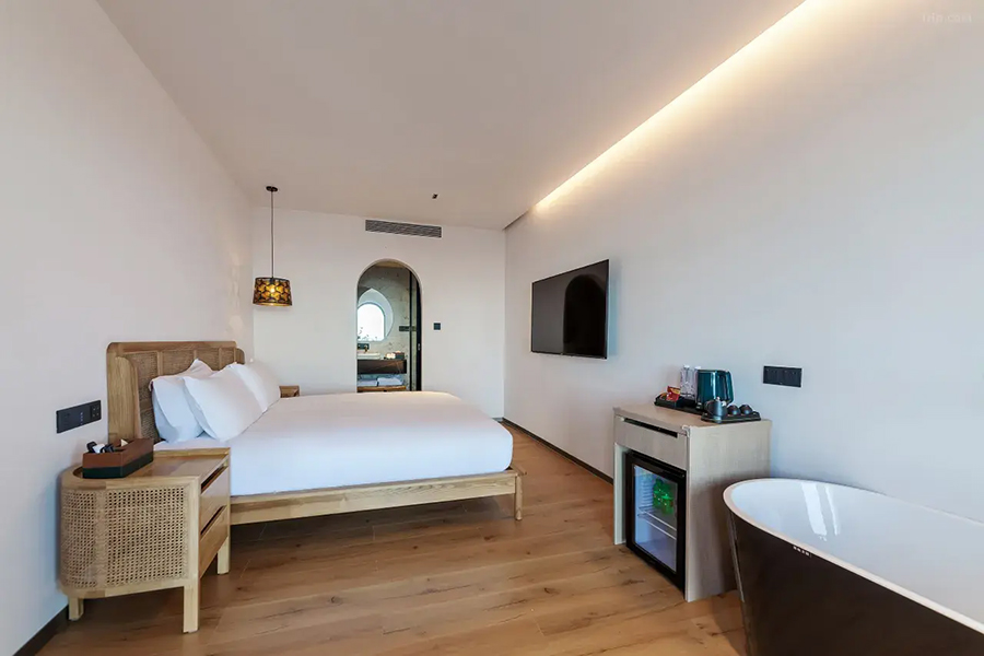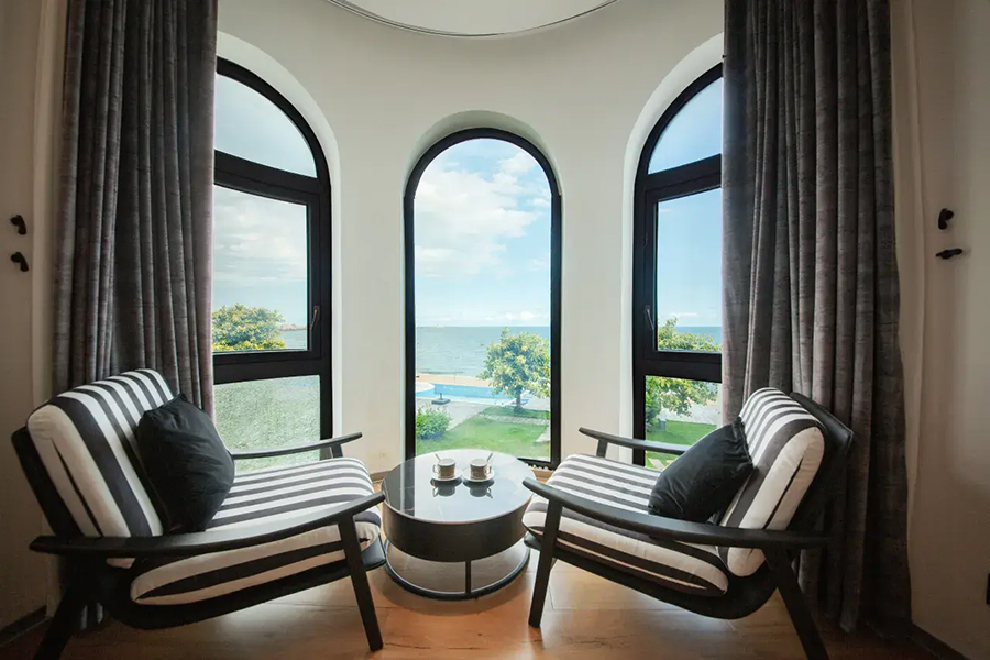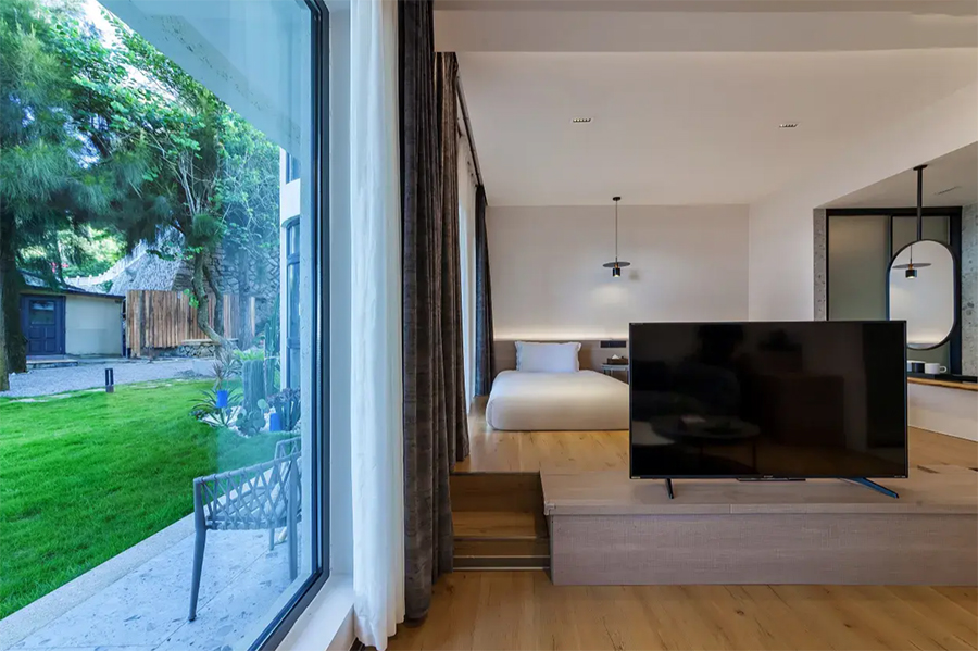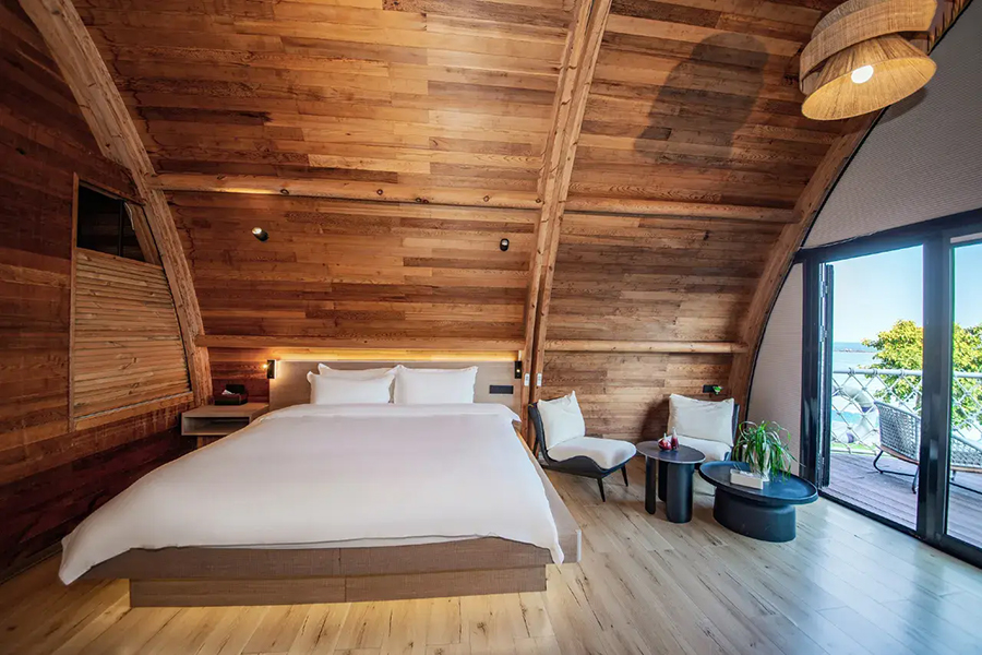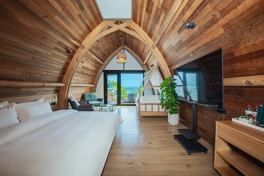湄洲岛泊澜·心宿海景度假民宿整体设计理念强调“引景入室”,内里为您提供有16间舒适客房,包含9间双床房、6间大床房和1间套间,能同时接待34人入住。每一间客房都拥有全景落地窗,部分客房还设有独立观景露台,让您能在不同角度欣赏蔚蓝海天盛景。更有特色的原木风森系小屋,自然感拉满,每天睁眼就好像沉浸于森林之中,连呼吸都仿佛带着海风的温柔,细节处尽显简约而不简单的品味,简直就是拍照打卡以及情侣小朋友的度假天堂。