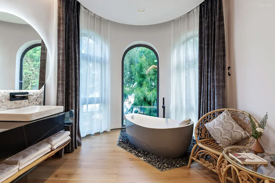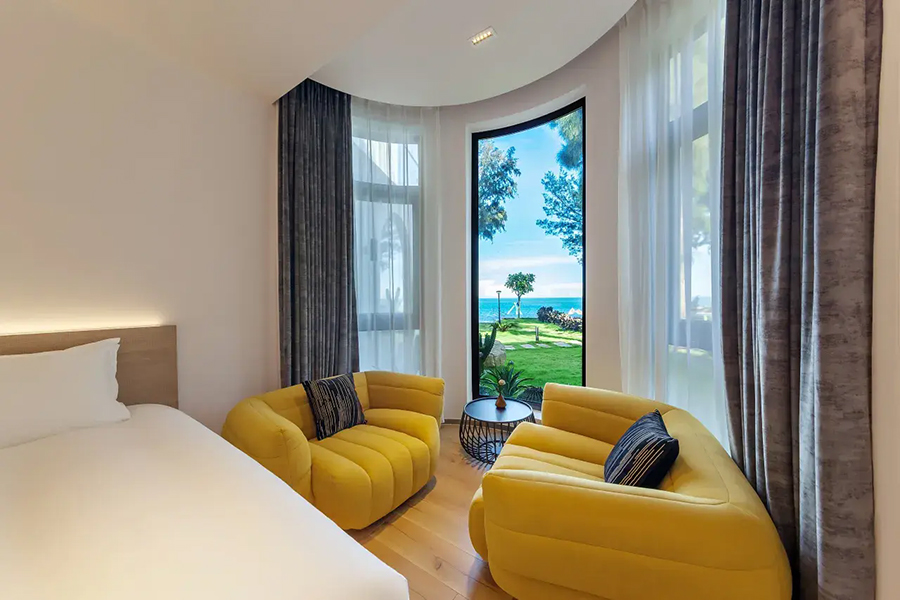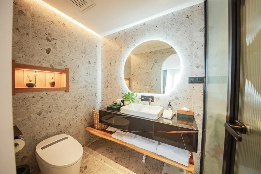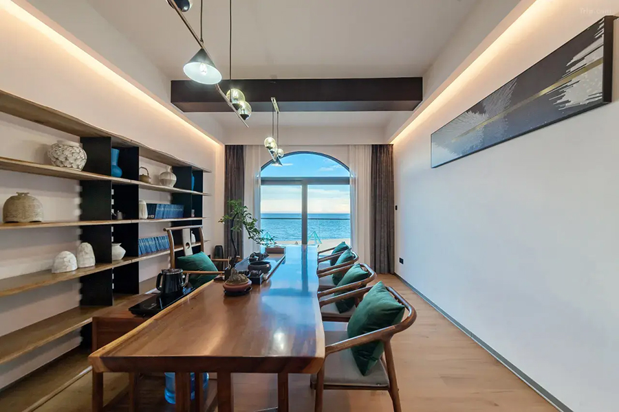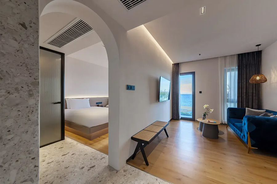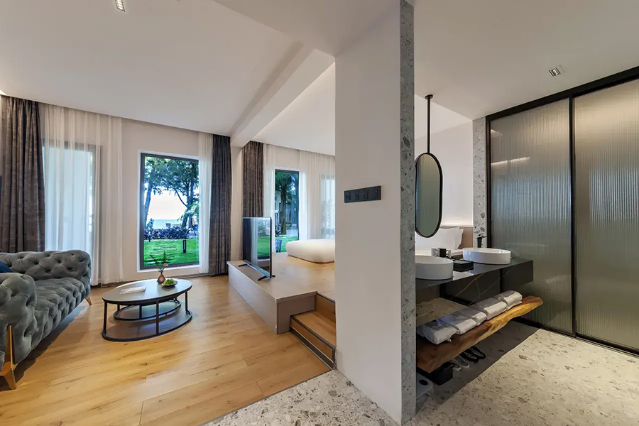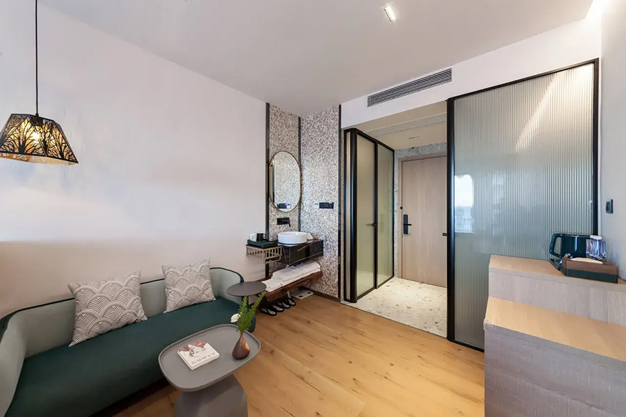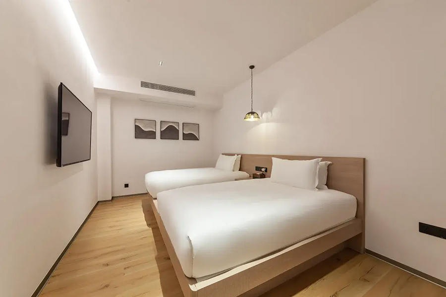 湄洲岛泊澜·心宿海景度假民宿整体设计理念强调“引景入室”,内里为您提供有16间舒适客房,包含9间双床房、6间大床房和1间套间,能同时接待34人入住。每一间客房都拥有全景落地窗,部分客房还设有独立观景露台,让您能在不同角度欣赏蔚蓝海天盛景。更有特色的原木风森系小屋,自然感拉满,每天睁眼就好像沉浸于森林之中,连呼吸都仿佛带着海风的温柔,细节处尽显简约而不简单的品味,简直就是拍照打卡以及情侣小朋友的度假天堂。