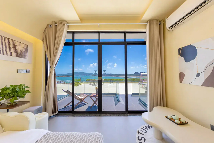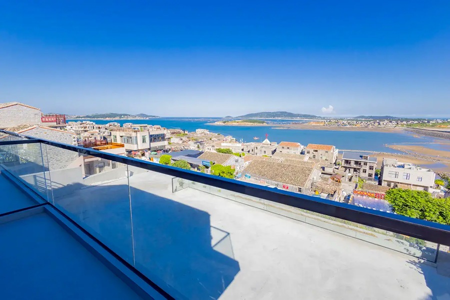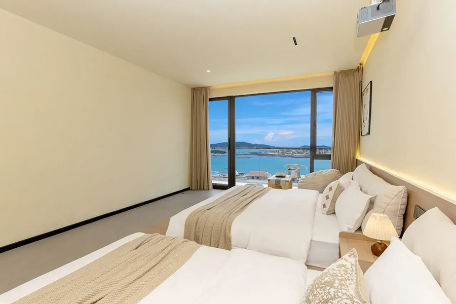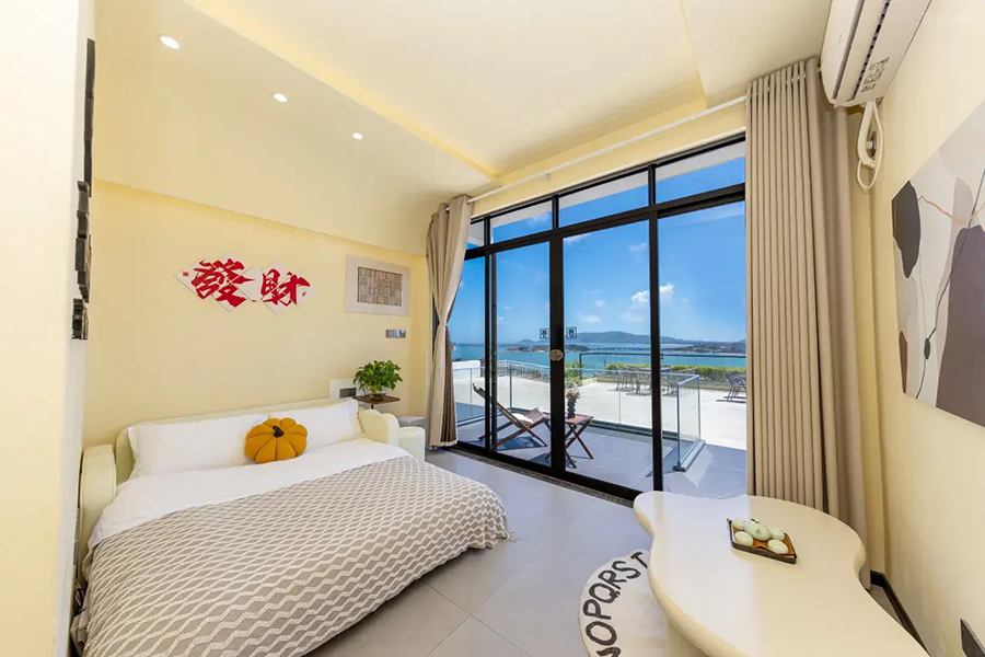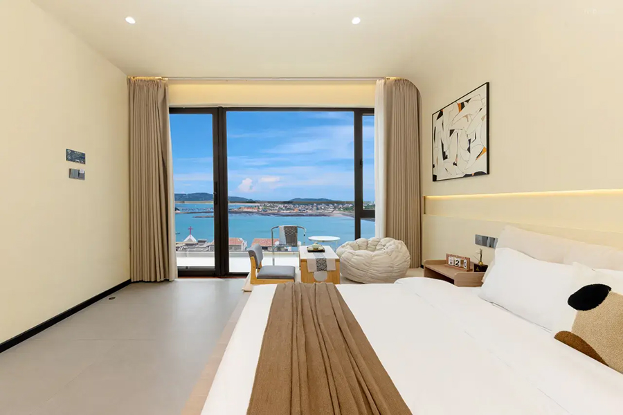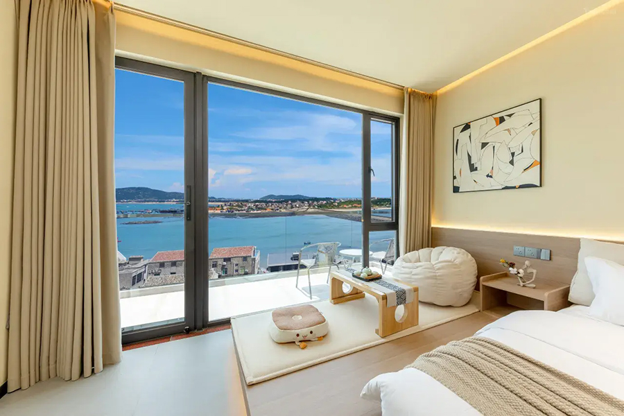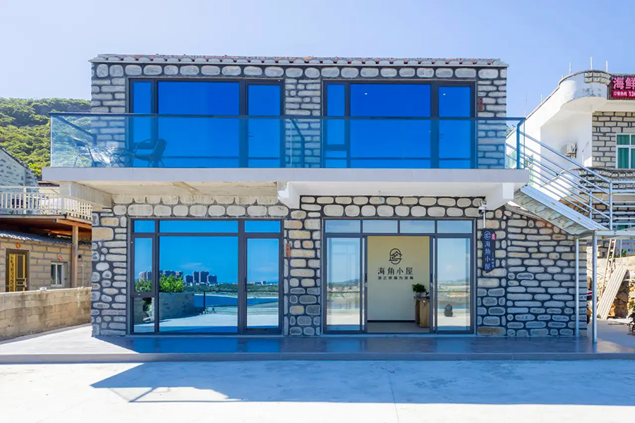 平潭北港海角小屋民宿依山面海而建,整体以古朴厚重的花岗岩砌筑,完美融合闽南渔村风情与现代舒适体验,外立面保留花岗岩肌理,内部采用原木、藤编与浅色系软装,搭配大面积落地窗与智能雾化玻璃,既保障180°无遮挡海景视野,又兼顾私密感。庭院空间宽敞,露天茶座、星空露台错落有致,海风穿堂而过携来草木清香,尽显度假奢享感。
