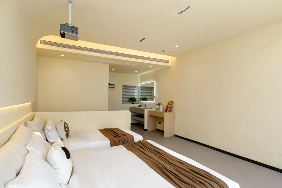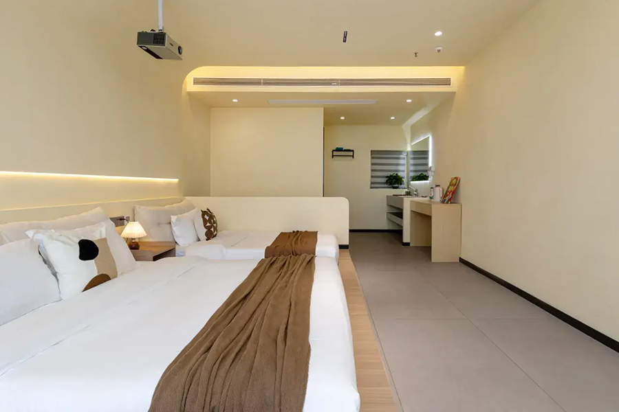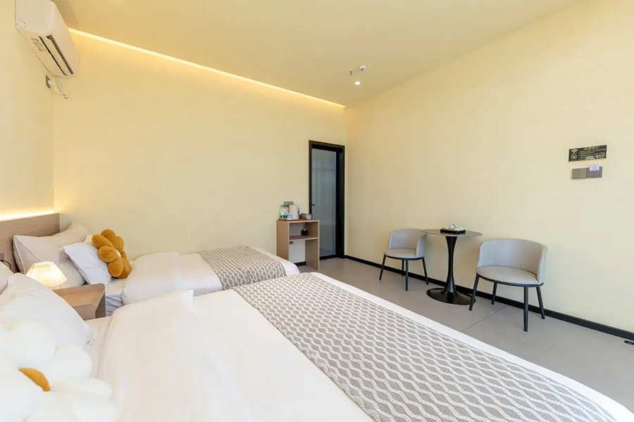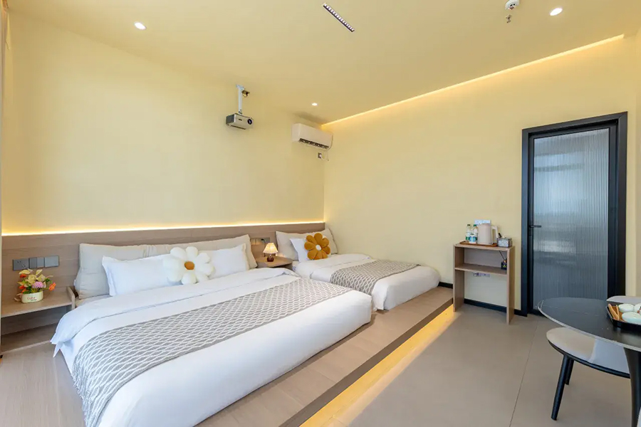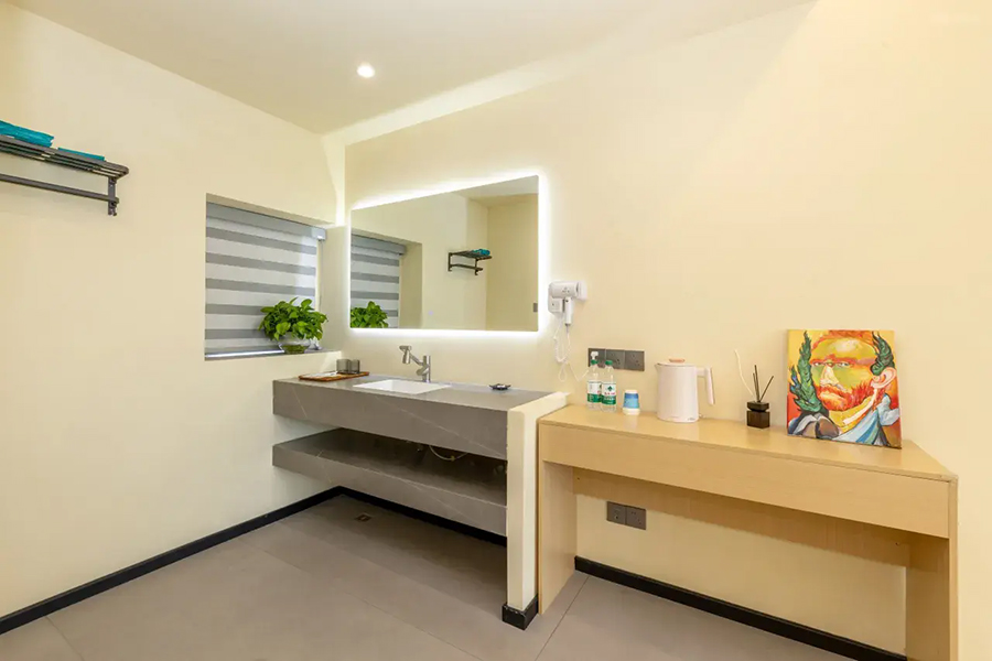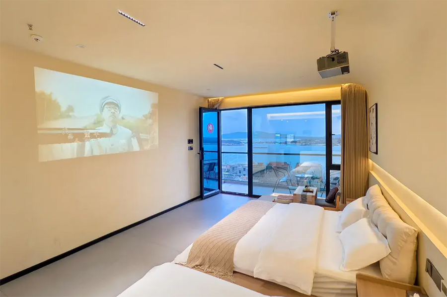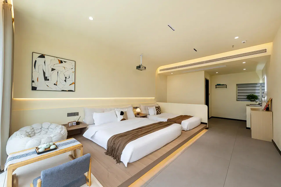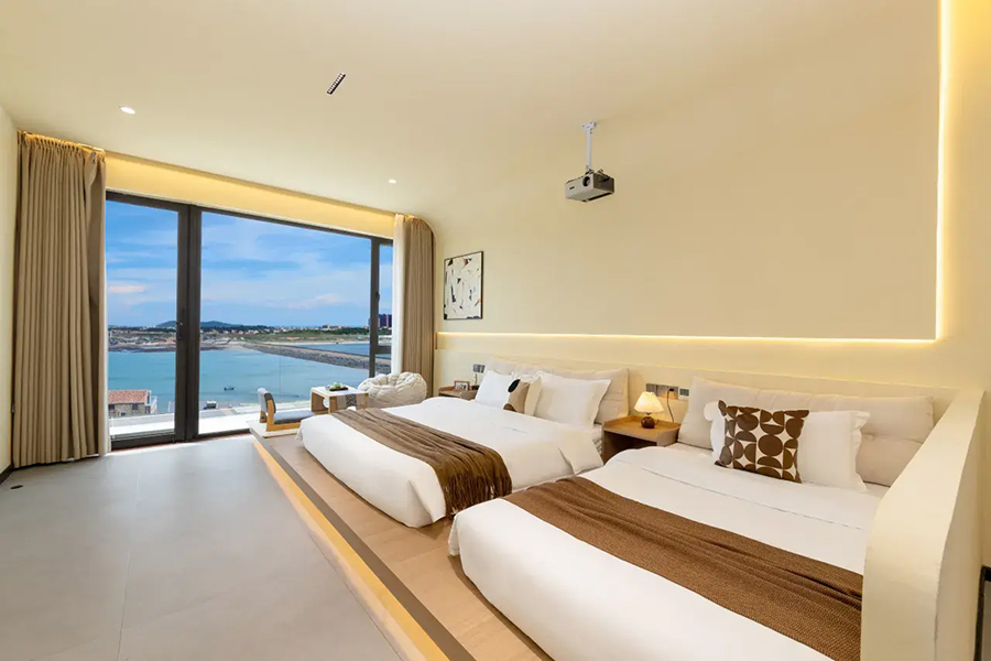 平潭北港海角小屋民宿依山面海而建,整体以古朴厚重的花岗岩砌筑,完美融合闽南渔村风情与现代舒适体验,外立面保留花岗岩肌理,内部采用原木、藤编与浅色系软装,搭配大面积落地窗与智能雾化玻璃,既保障180°无遮挡海景视野,又兼顾私密感。庭院空间宽敞,露天茶座、星空露台错落有致,海风穿堂而过携来草木清香,尽显度假奢享感。