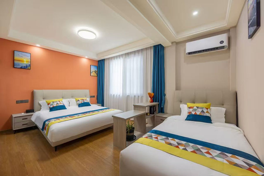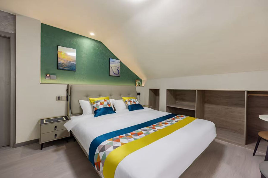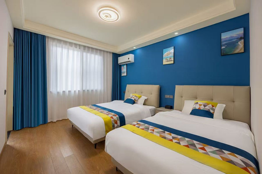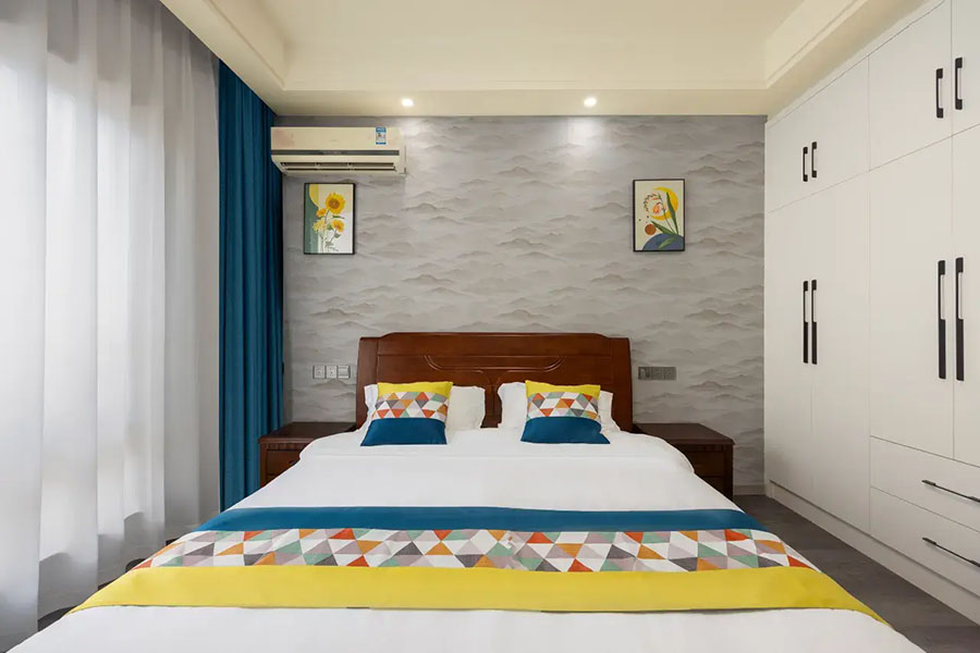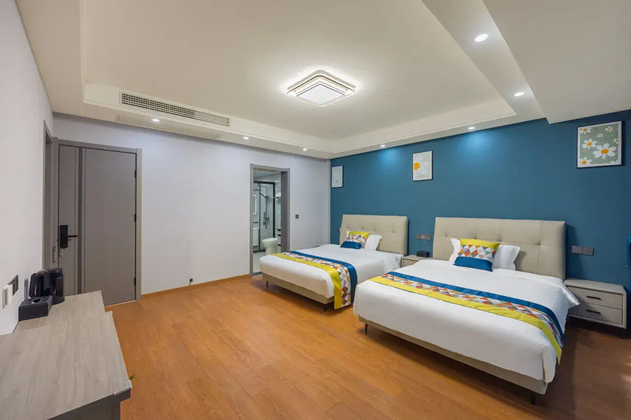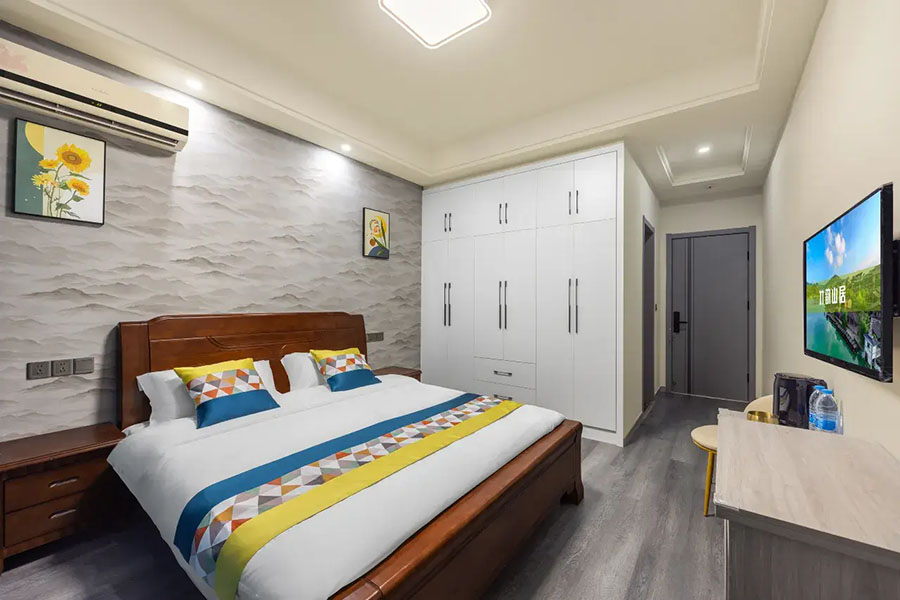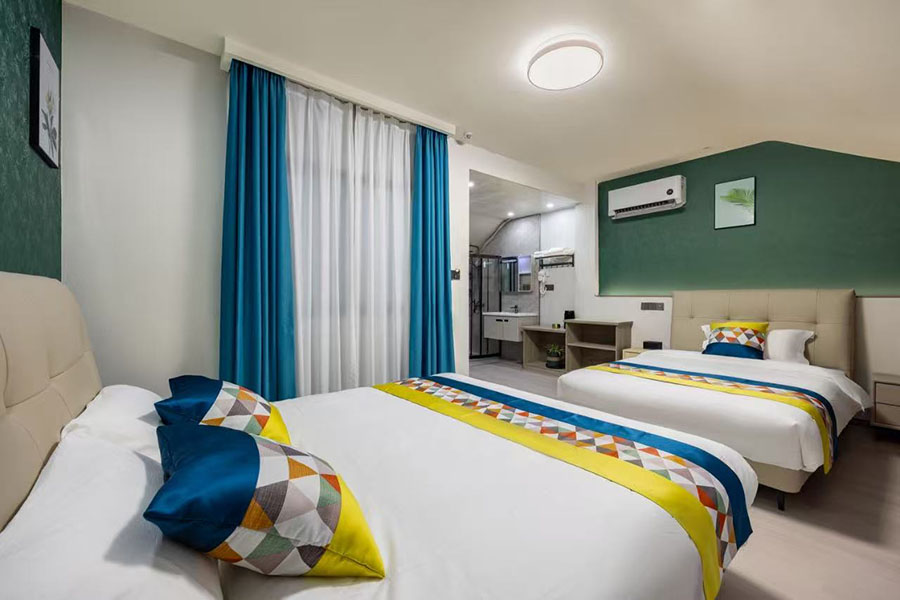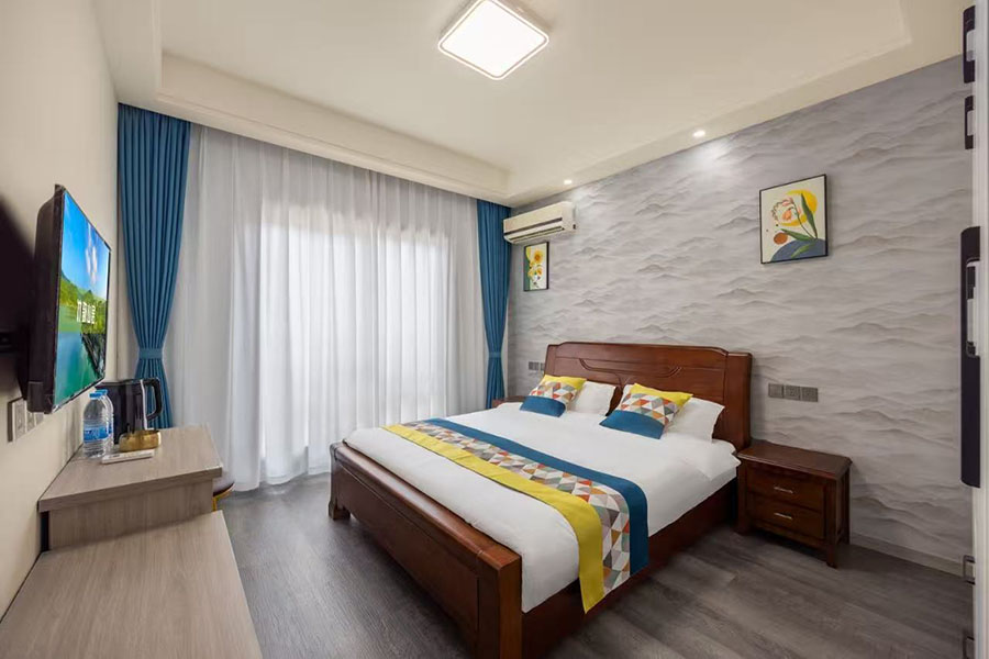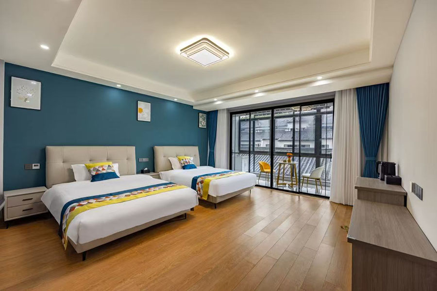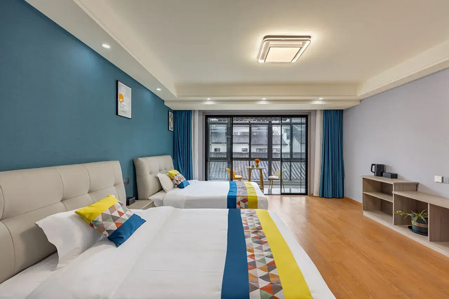 宜兴竹韵山居民宿地处窑湖小镇旁的特色民宿村内,是一栋白墙黛瓦的江南水乡建筑,周边都是清一色的复古别墅小院,与周边的翠竹青山相映成趣,环境惬意雅致。民宿共有6间舒适客房,包含2间标间、2间大床房和2间家庭间,能同时接待14人入住。客房设计精致美观,属现代简约的装修风格,环境大气,氛围温馨,均配备了齐全的硬件和生活设施,部分客房还设有独立观景阳台,推窗即揽山景湖光。午后坐在露台的藤椅上,泡上一壶宜兴阳羡茶,看云卷云舒,尽显山野度假的松弛惬意。