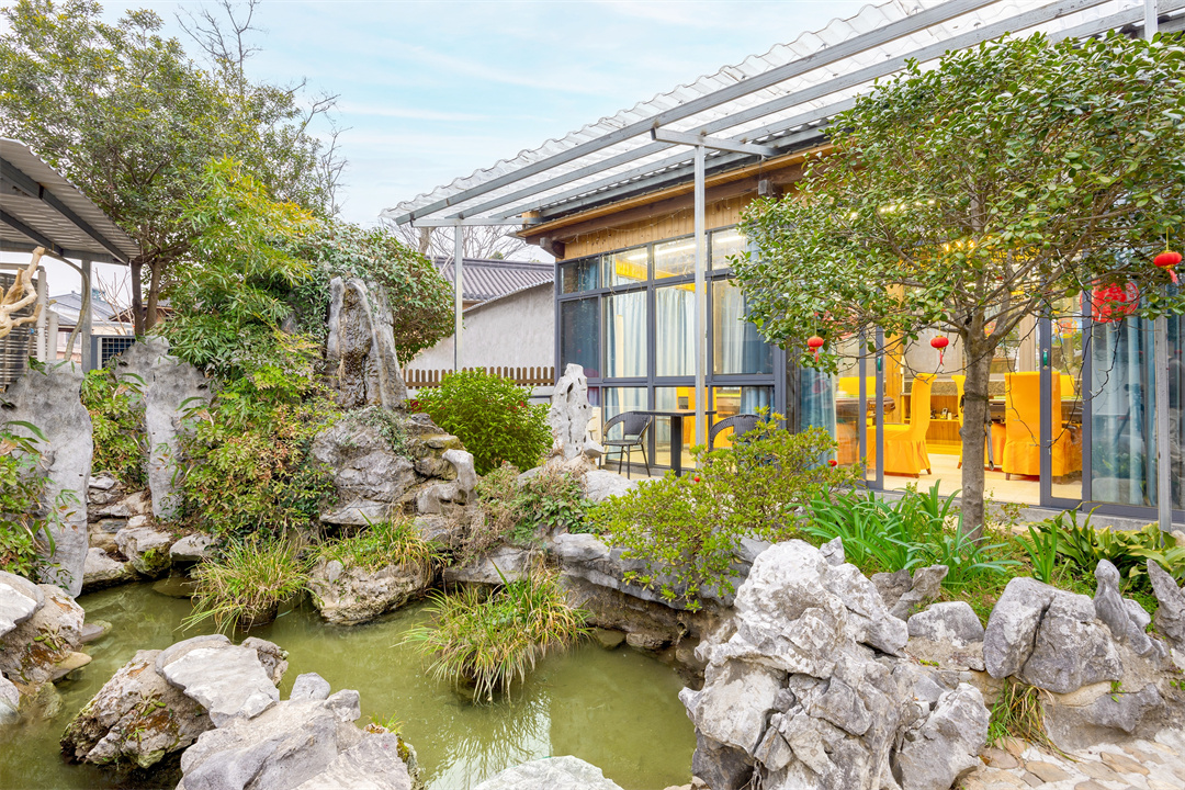 宜兴竹海阮氏酒家农家乐依山傍水而建,是一家食宿一体的精品度假酒店,地处竹海的环抱之中,是复古的园林设计,大门是非常有特色的廊亭风格,沿着石板路走进院中,花朵绿植缤纷争艳,石桌石凳也为小院增添了无限古韵。民宿主体是灰瓦白墙的二层小楼,环境简约精美,非常适合家庭以及情侣度假选择,景色十分动人。