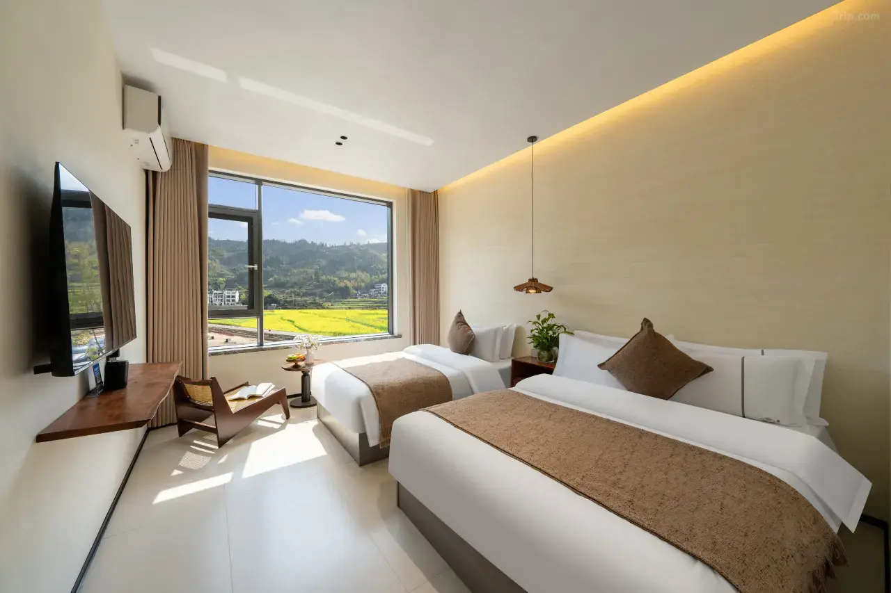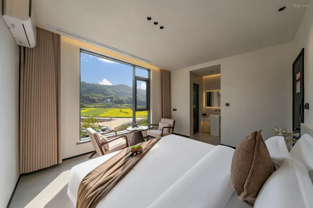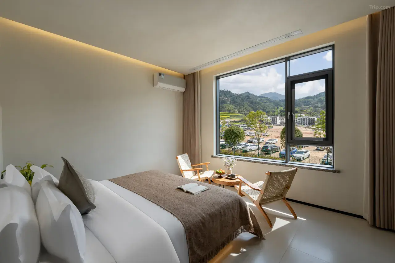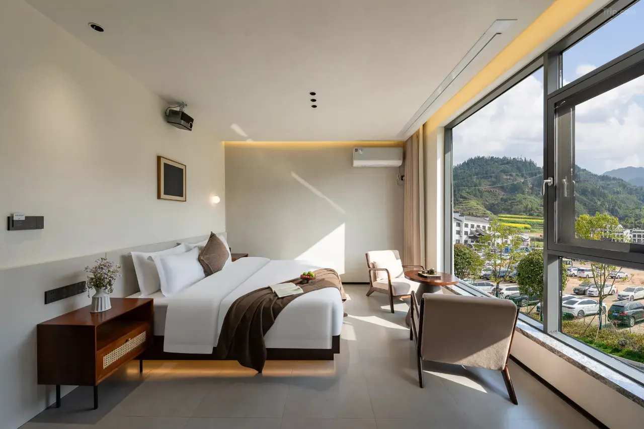 婺源清风·山语美宿规模适中,提供有9间优质客房,包括有2间标间、5间大床房和2间套房,可同时接待22人入住;房间布局通透明亮,配备有空调等齐全的硬件设施,全部采用古朴雅致的新中式田园设计,环境素雅简约,大气精美,拥有绝佳的入户观景视野,足不出户就能将山间云雾之美尽收眼中,无论是拍照还是赏景,体验感都是超棒的!
