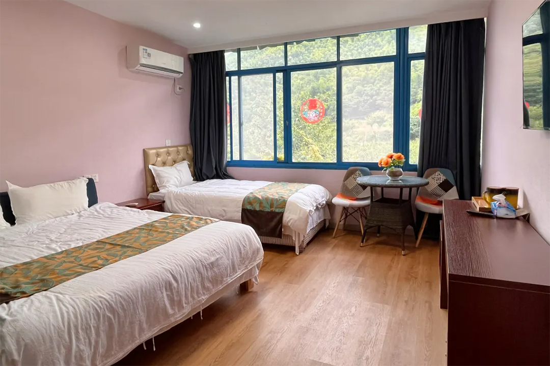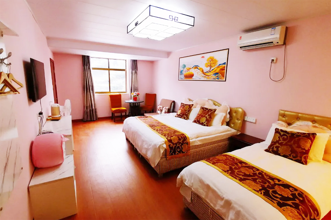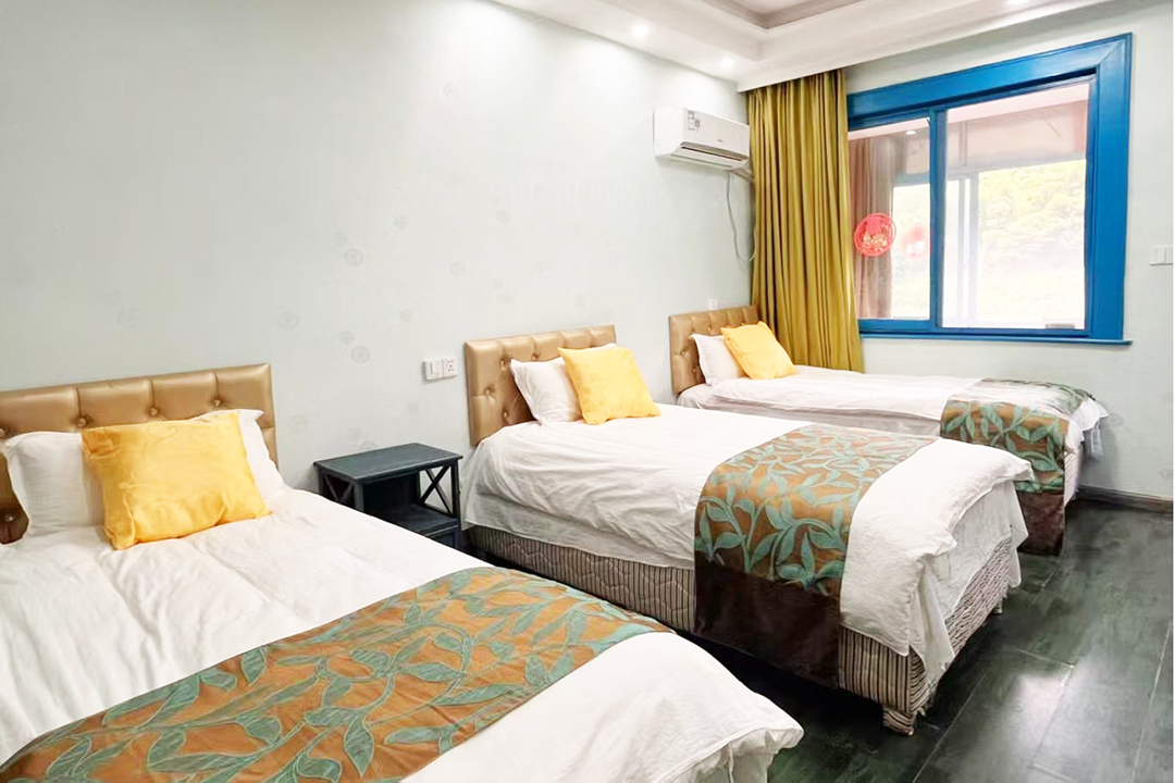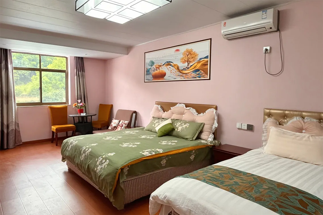 余姚松阳山庄规模适中,共有10间舒适客房,提供有4间标间、2间大床房、2间三人间和2间亲子间,能同时接待24人入住。山庄内部是新中式结合了现代风格装修,每间客房都采用不同配色,全部按照酒店式布局,配备有空调、电视、无线网、独立卫浴等齐全设施,居住氛围温馨舒适,环境整洁清爽,床单被罩全部一客一换,让前来游玩的您,都能有一个最理想的居住体验。